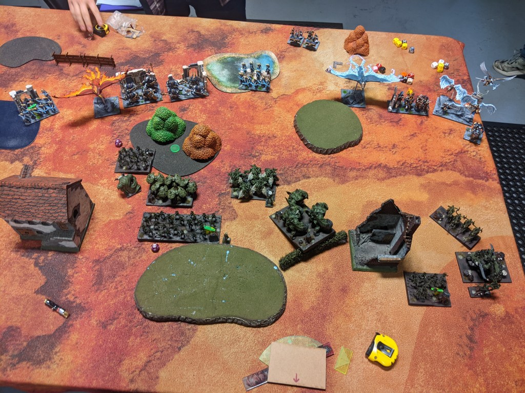 Battlelines! Or slightly after the scouting phase anyway. He’s got two tokens in the hard left Paladin Foot Guard and one in the Sisterhood Scouts near them. I’ve got two in my Tribal Warrior horde and one in the Tribal Warrior reg on the right.