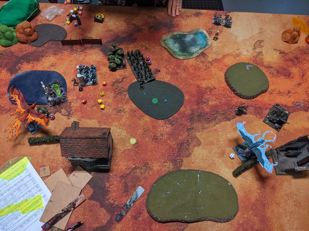 Turn 1: The Salamanders advance wearily and unleash a startling amount of shooting, with the 10 damage done to the right Brutes being the standout (5+ from the Komodons alone). The Hallow holds firm, then pushes up in response, with the leftmost Centaurs getting the party started by grounding the Scorchwing regiment. I’m a little at a loss for what to do overall but am hoping the Lycan Alpha can dive in from the left and help me open up that flank.