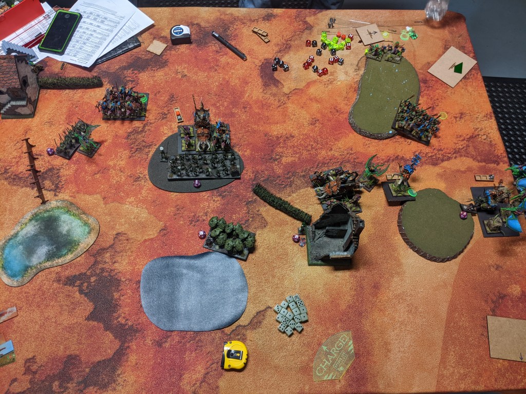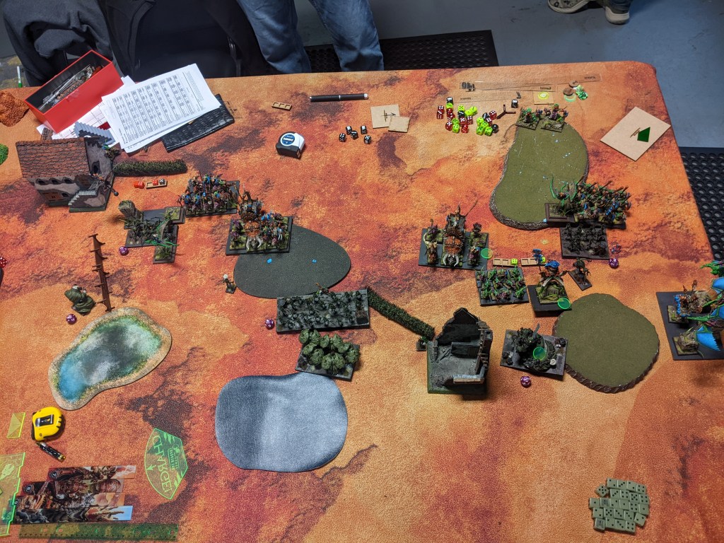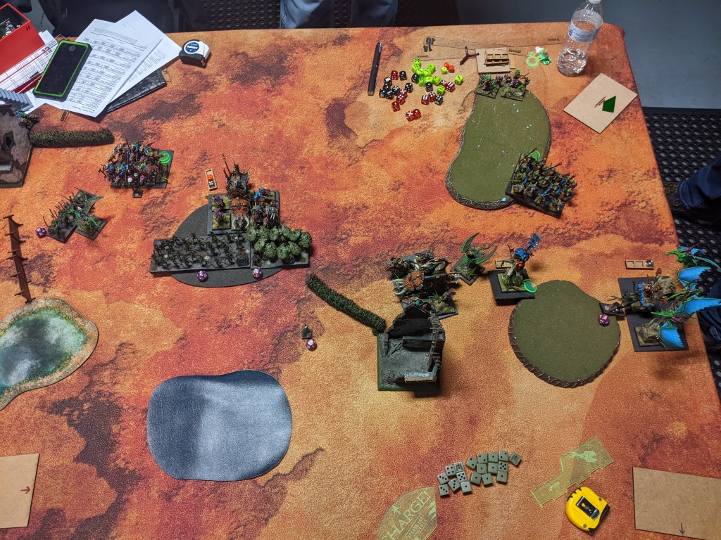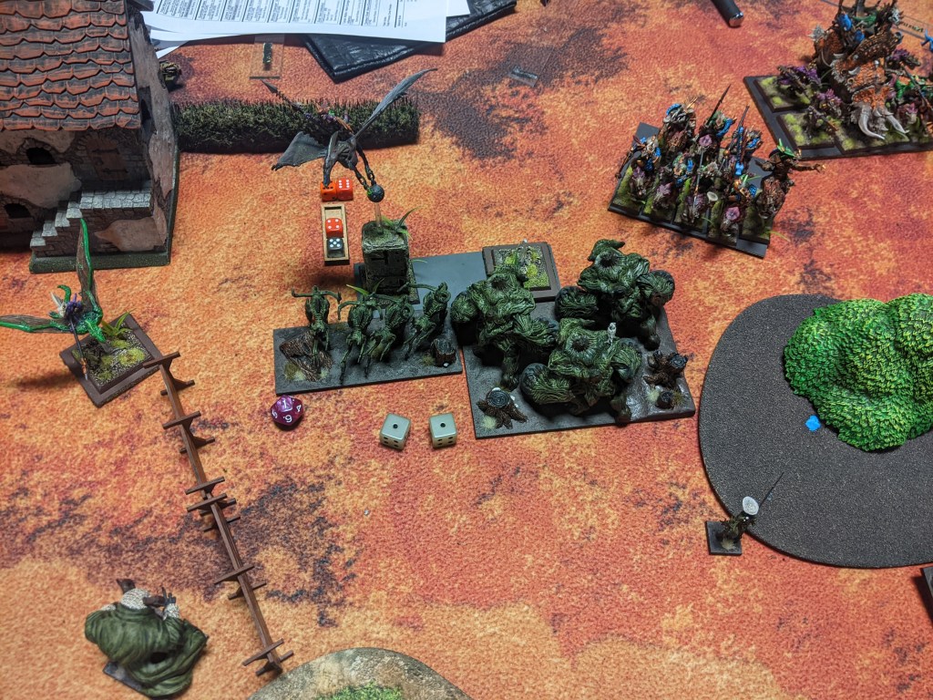Herd 2: I attempt to unjam the right by flanking the Hunters with hindered Tribal Warriors, but 24x 5+ / 3+ is too much of an ask and the Hunters are fine. The other Tribal Warriors charge Rakawas for a few damage and to block him up, as 300 points of Lycan mega-hammer picks up the Brutes’ kill token and waits. I think for a very long time about the left, and notice that if the Stampede helps those Centaurs out with the Scorchwing regiment, it can rotate after combat and disappear from the Rhinosaurs’ LOS, leaving only the milksop Lancers to take it on. It’s an easy kill and I go for it … and roll snake eyes. This disastrously gives said Rhinos the Stampede’s flank, and Eric the game. Ah well.