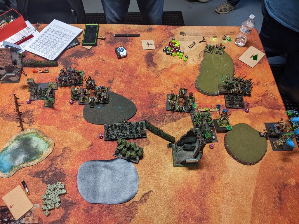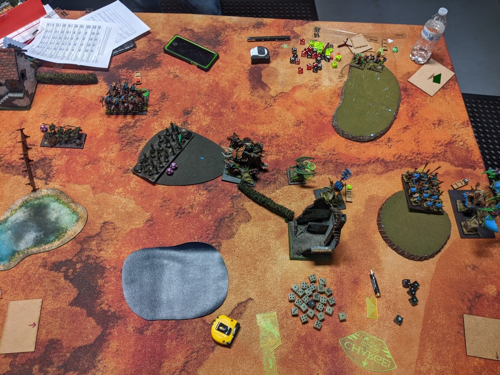 Basileans 5: The Sisterhood Scouts advance to block for the Foot Guard token caddies, but their shooting (and maybe the arbalests’, tho they had been cooling down over the course of the game) successfully wavers the Tribal Warrior horde. Gnaeus finishes off the Stampede and faces the Lycan horde. I’m sure the orange Phoenix slapped away at the Lycan Alpha.