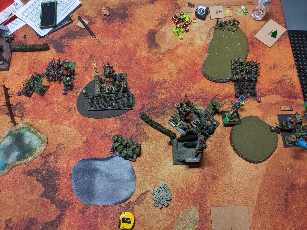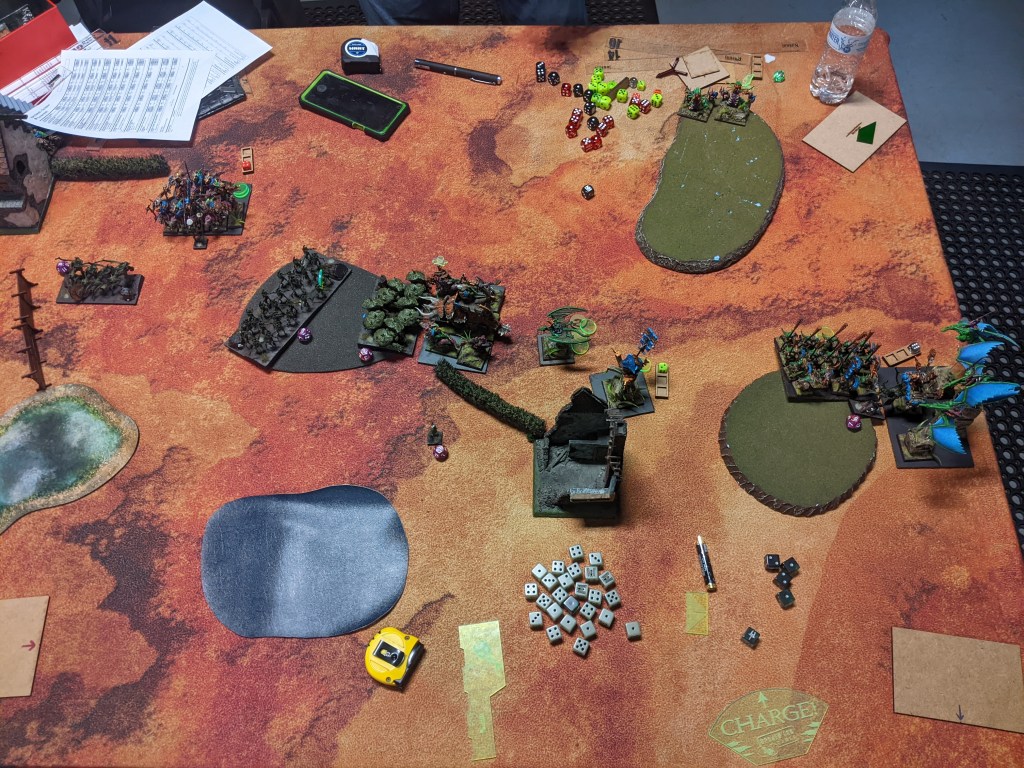 Herd 4: It’s officially on, dear readers. The surviving Brutes withdraw and charge the other Palace Guard, making space for the Tribal Warrior horde to plow into the mangled horde of ogres – they had to shed 1 booty token to go back to Sp 5 but worth. Both Palace Guard units are smashed. The Lycan Alpha continues grounding the orange Phoenix, as the Great Chieftain charges and shuts down the blue Phoenix. On the right, the Stampede bips some damage onto Gnaeus (only CS1 when disordered) but the Lycans rear charge the Elohi, decimating them (and taking my token back).