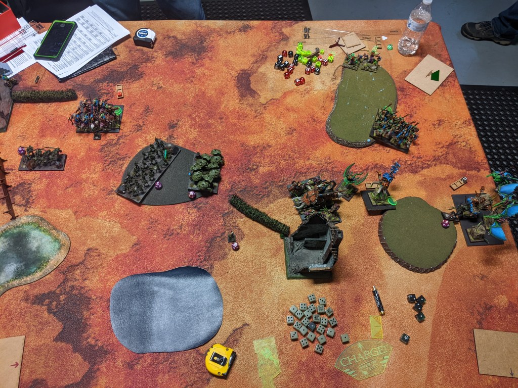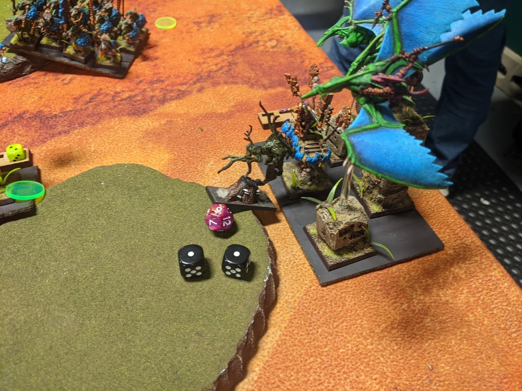 Elsewhere, the Lycan horde kills the Hunters (possibly because that was all I was offered, possibly because I didn’t fancy one rounding Rakawas) and turns to be out of Rakawas’ LOS but very much in the Rhinosaurs’. The Centaur Chief disorders the Scorchwing horde, and way over on the left the Centaurs finish off the Scorchwing regiment they had been fighting for 3 turns.