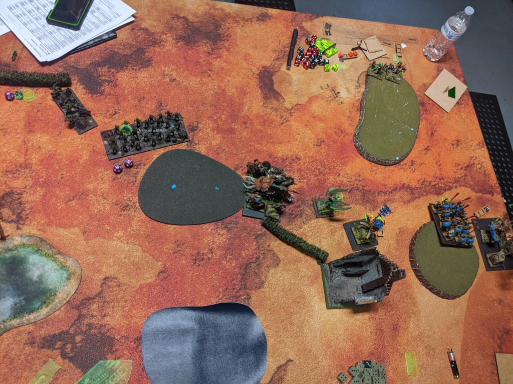 After a slow start, Eric had gradually pushed up the tables throughout the event, and would turn out to be an exceedingly nice dude (and my favorite opponent). Of the Salamander armies at the tournament, Eric’s was the one I was hearing the most about, in particular the bonkers numbers of shots it has. Obviously, charging into a wall of highly mobile shooting isn’t great for a Herd army but needs must!
