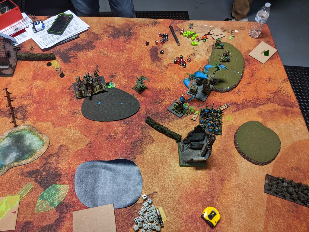 Herd 3: I melt my clock and eventually realize I can charge Artakl with the Tribal Warriors horde, overrun 5″ into the central Rhinosaurs, and flip them over thanks to the Lycan Alpha in the flank. It’s not great odds (2/3 of a chance the overrun is no good!) but it’s what I got to open the left back up. I make a very real mistake and heal 1 damage off of the Tribal Warriors instead of bane chanting them (I didn’t realize Artakl is De 5+ and not 4+ but more importantly forgot I was aiming to fight the Rhinos, who definitely are De 5+ and I’ve got no TC behind the horde). I do next to no damage to Artakl on 3+ / 5+ yet I hot hand the Nv roll and rout the lizard twice, and I make the 5+ overrun, even if it’s hindered. The Rhinosaurs take 9 damage from the flanking Lycan Alpha, the Great Chieftain in the front, and the overrunning horde (match says 9-11, +2 if I hadn’t messed up bane chant), dread pushes this to 10 and I fail the break. Eric had offered to let me rewind and count the horde’s dice with bane chant on there but I couldn’t, that was well and truly my fault.