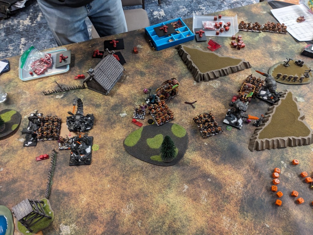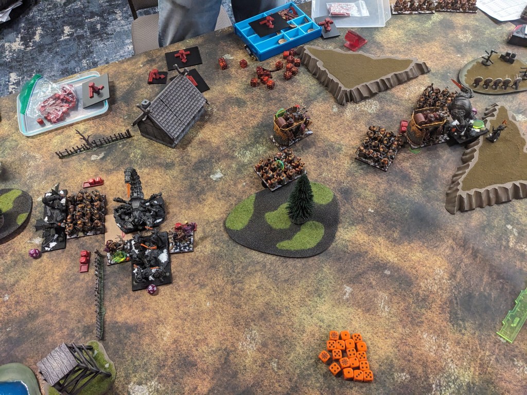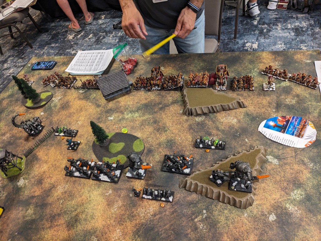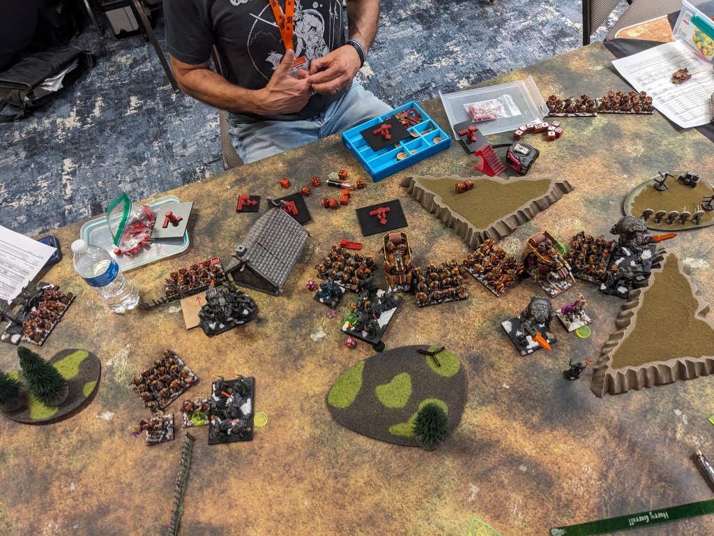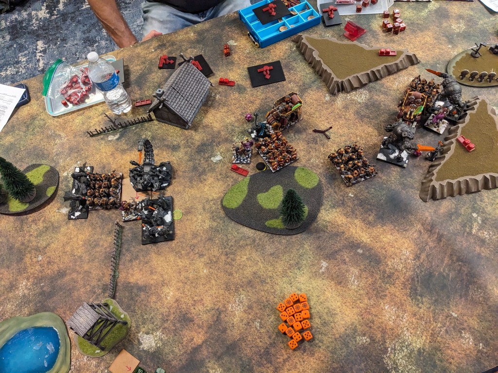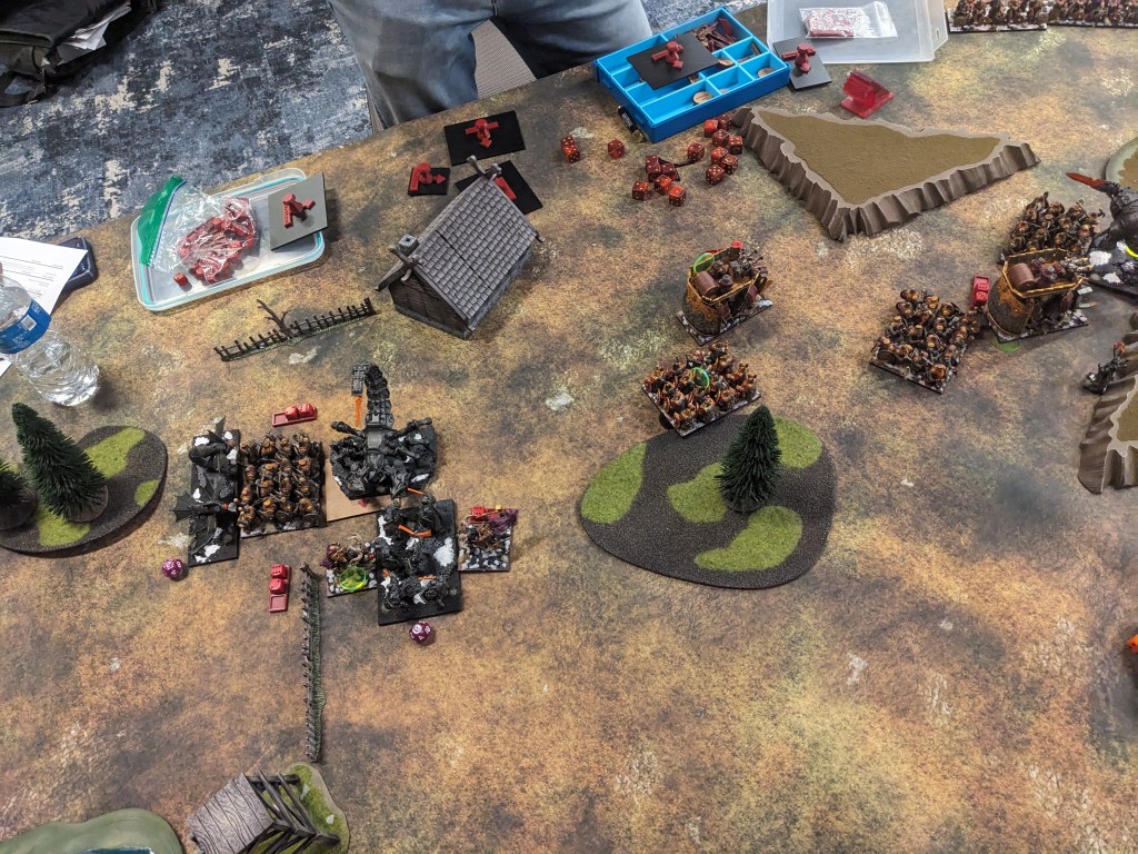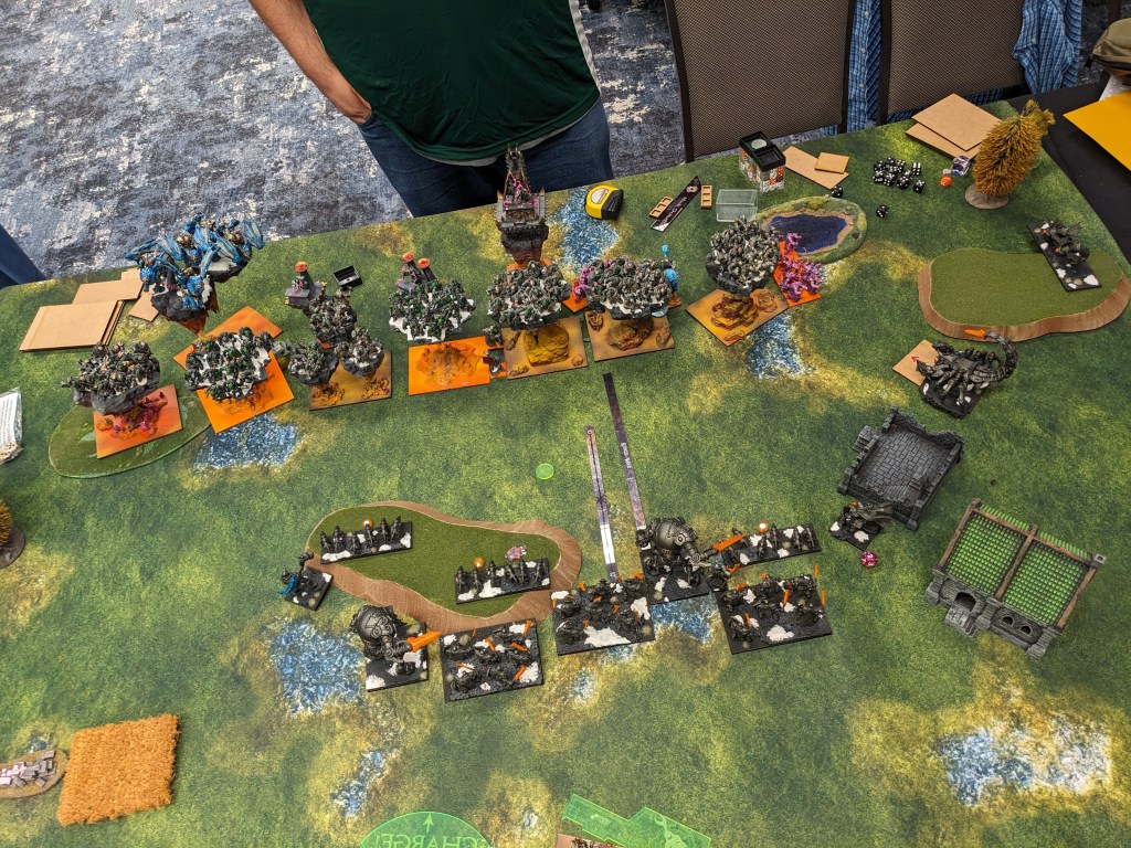 As these things work out, I ended up driving a few hundred miles to face a dude from the Northeast, mercing for another region. Happily I’m not sure that I’ve ever played Nick? Maybe in Warhammer Fantasy days. Anyway, this year Nick was piloting the RFO struggle bus. Loads of chonky regiments, loads of individuals with loads of spells, the shrine, some cats. Very little that honestly concerned me from an offensive standpoint, but for sure a ton of scenario pressure!