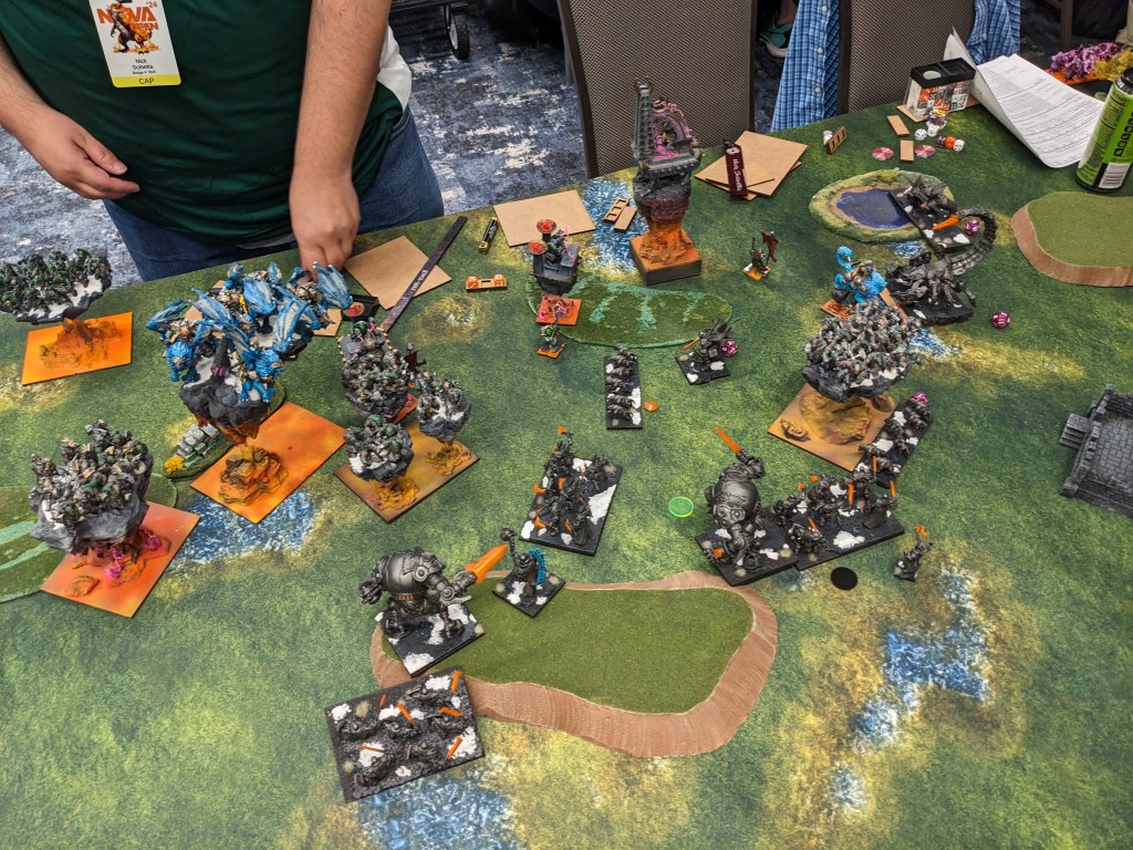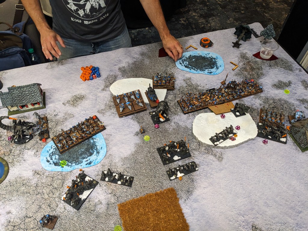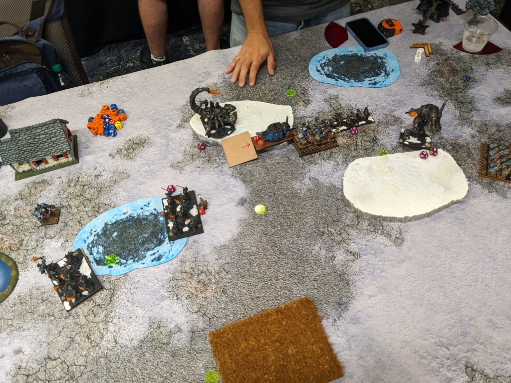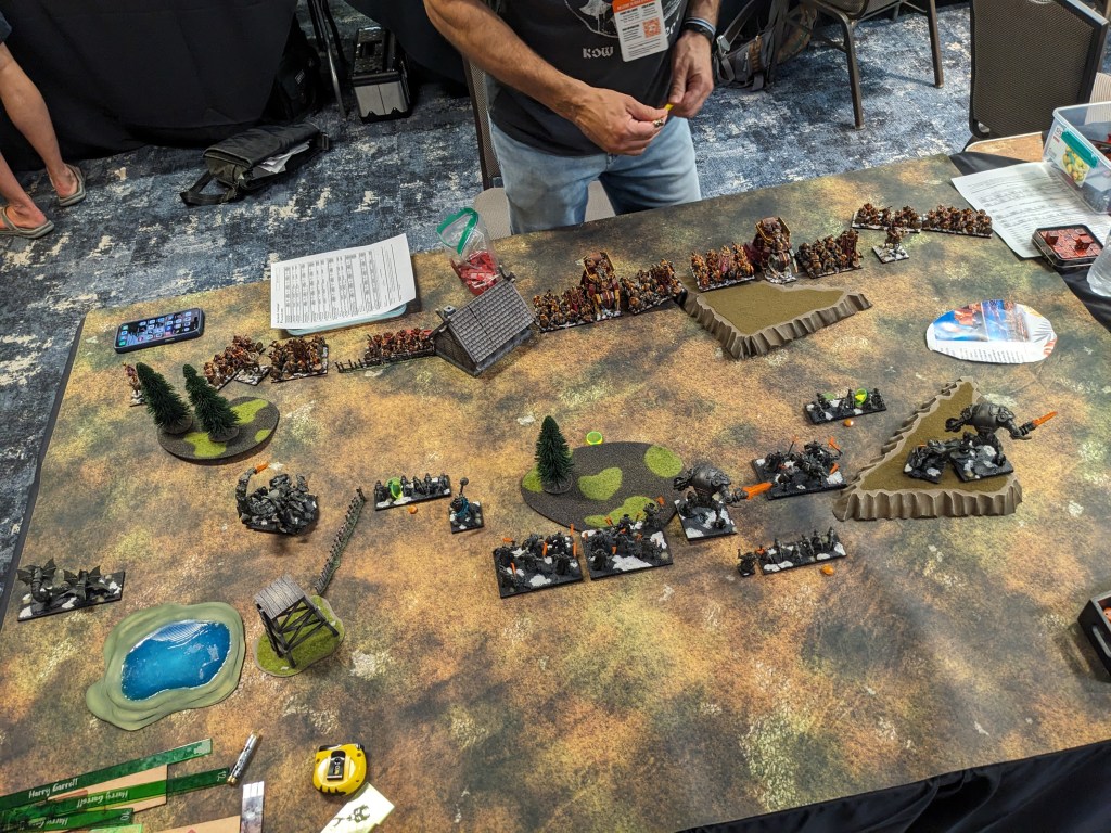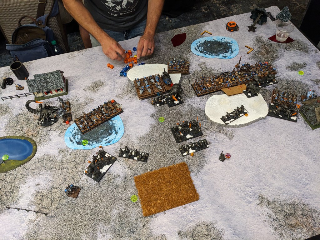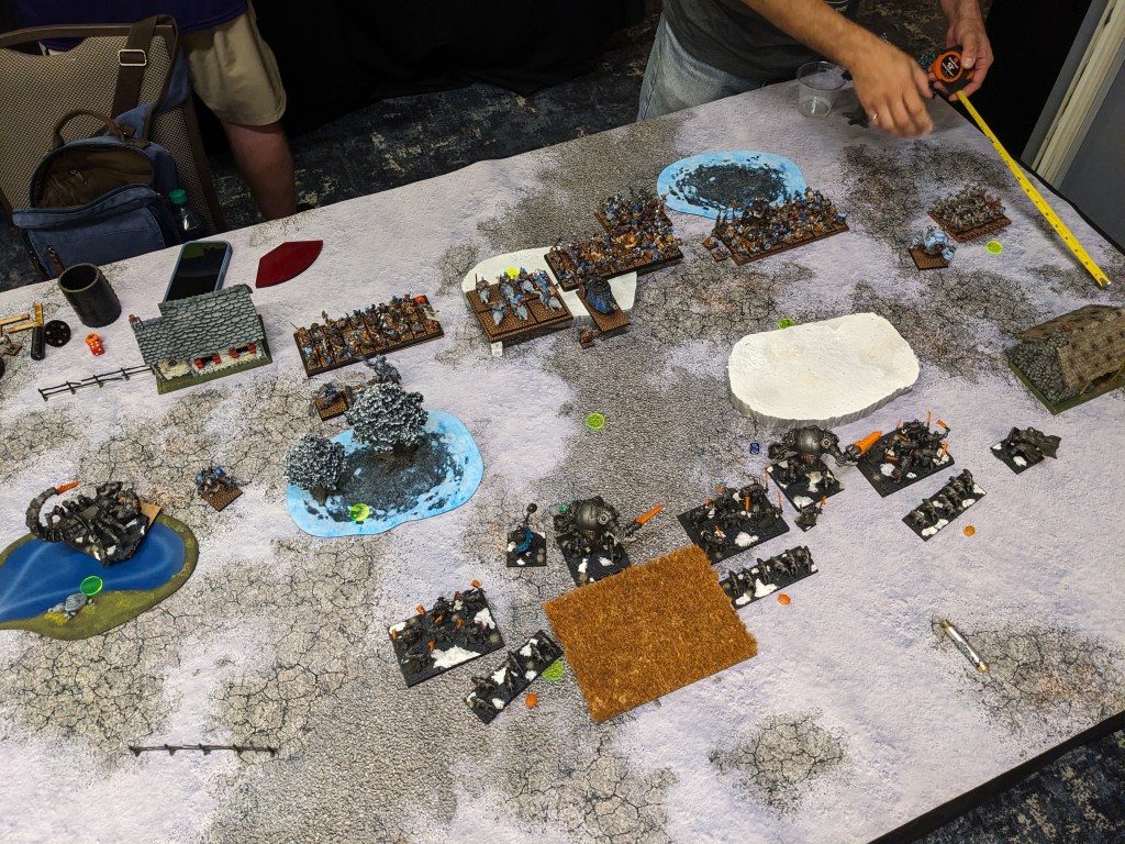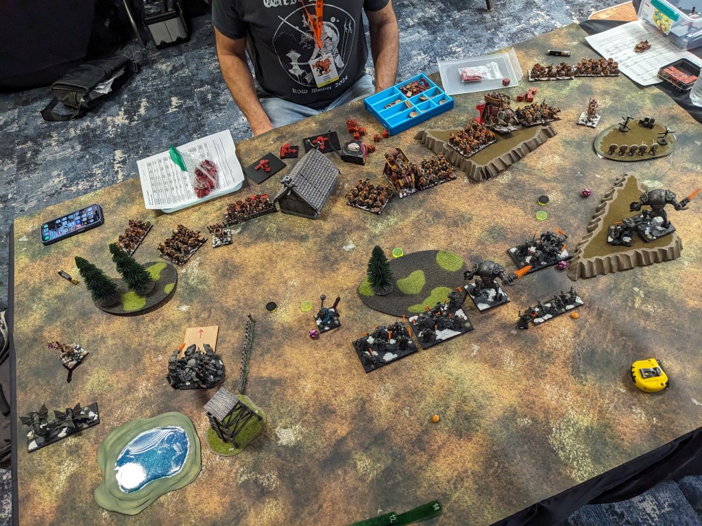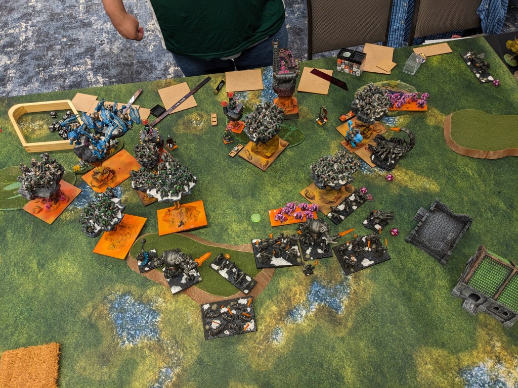 As these things work out, I ended up driving a few hundred miles to face a dude from the Northeast, mercing for another region. Happily I’m not sure that I’ve ever played Nick? Maybe in Warhammer Fantasy days. Anyway, this year Nick was piloting the RFO struggle bus. Loads of chonky regiments, loads of individuals with loads of spells, the shrine, some cats. Very little that honestly concerned me from an offensive standpoint, but for sure a ton of scenario pressure!