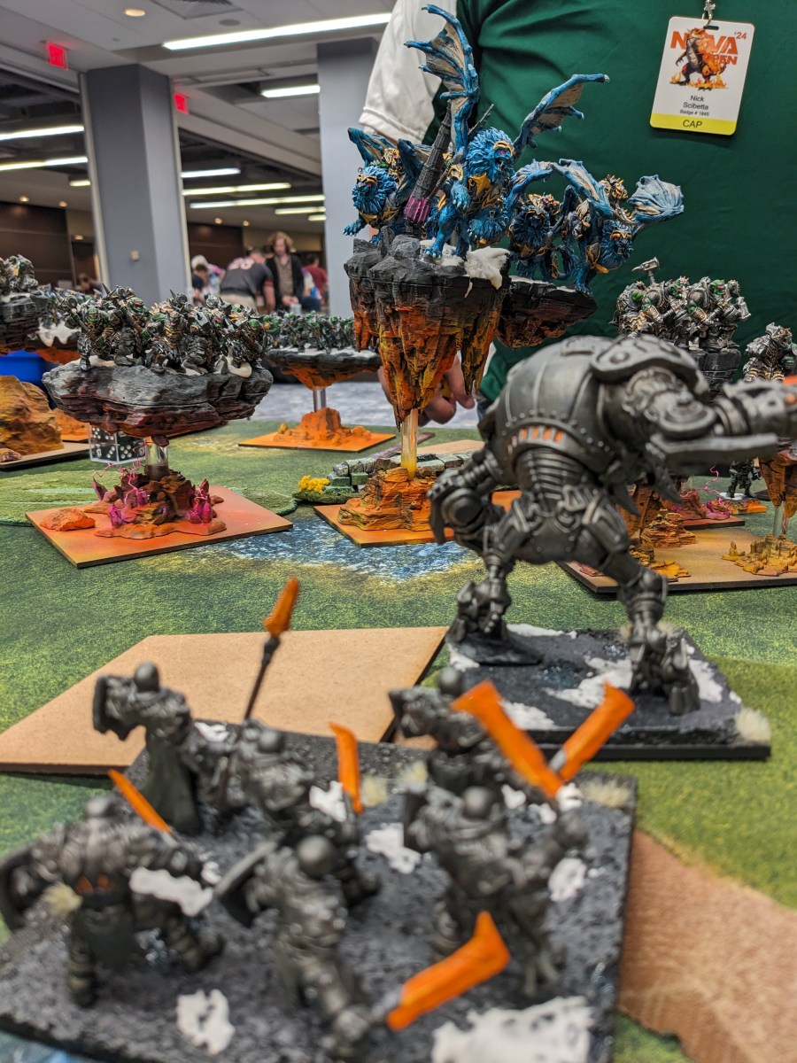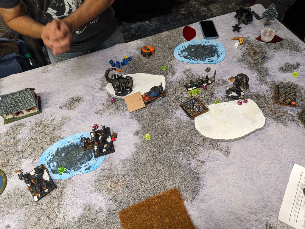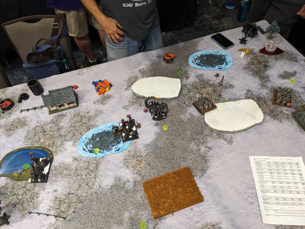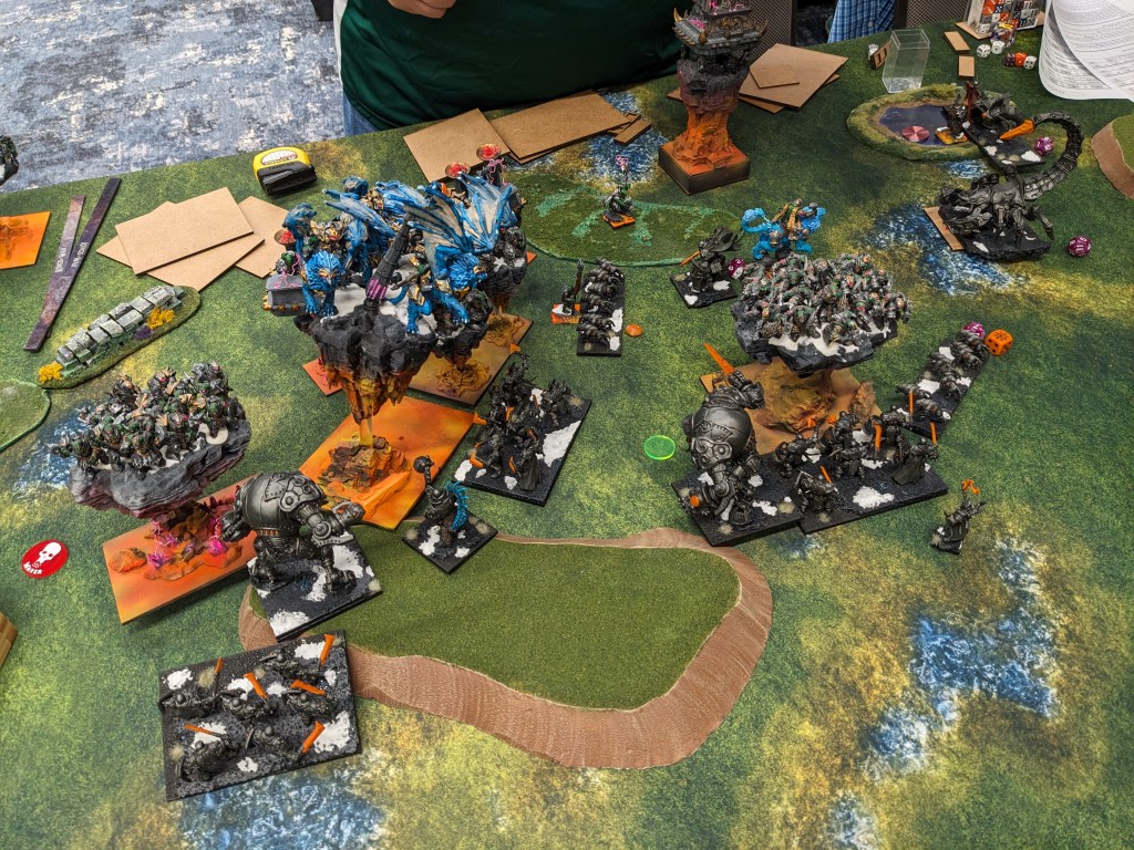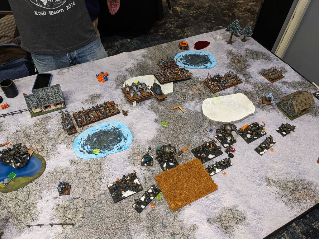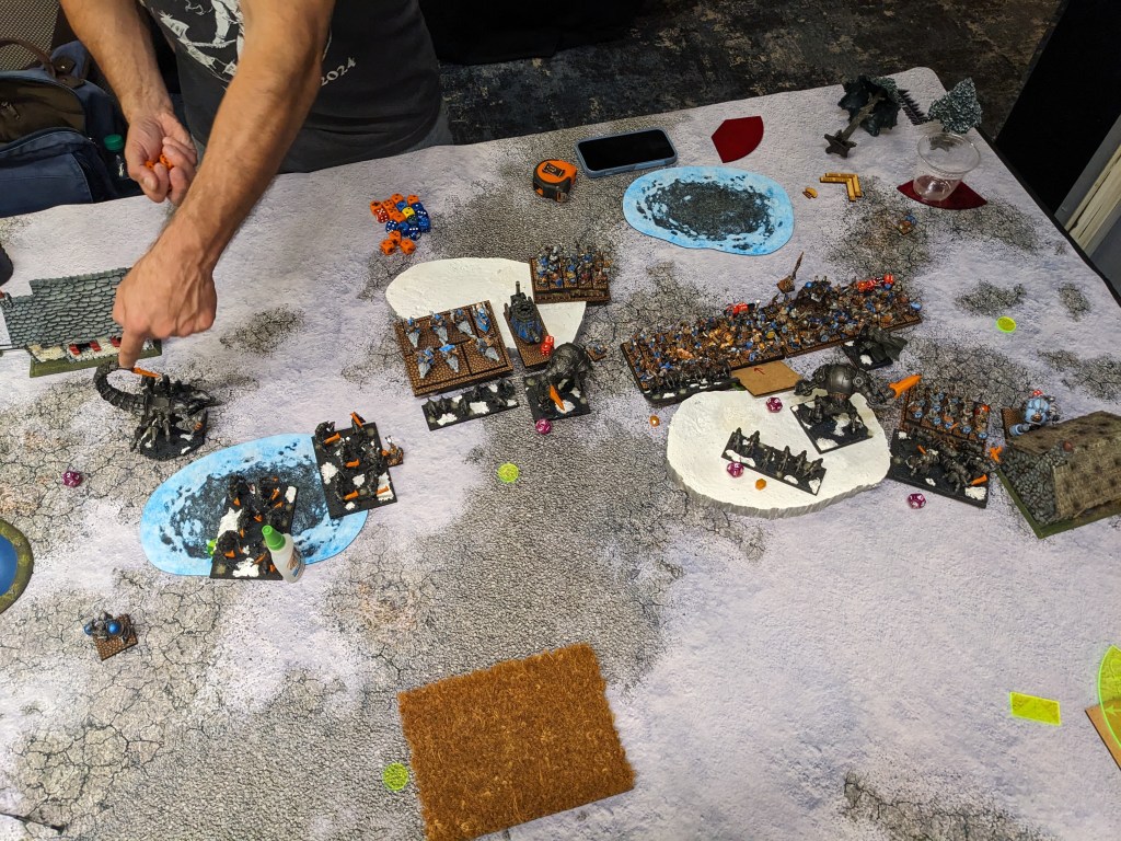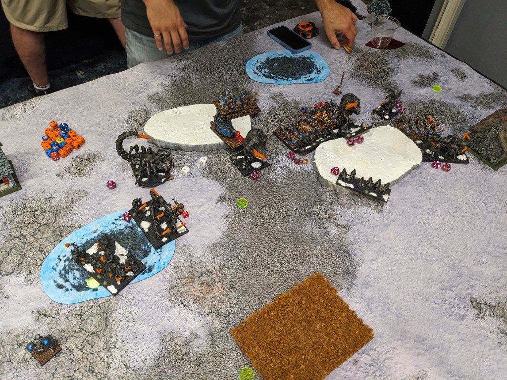 As these things work out, I ended up driving a few hundred miles to face a dude from the Northeast, mercing for another region. Happily I’m not sure that I’ve ever played Nick? Maybe in Warhammer Fantasy days. Anyway, this year Nick was piloting the RFO struggle bus. Loads of chonky regiments, loads of individuals with loads of spells, the shrine, some cats. Very little that honestly concerned me from an offensive standpoint, but for sure a ton of scenario pressure!