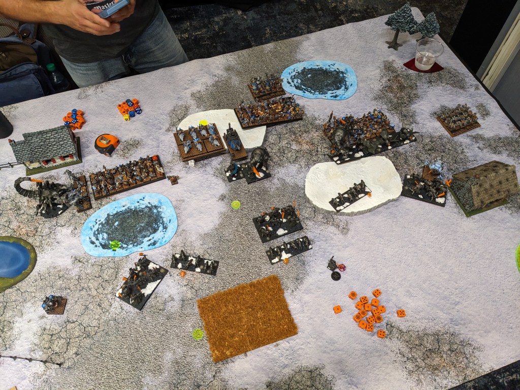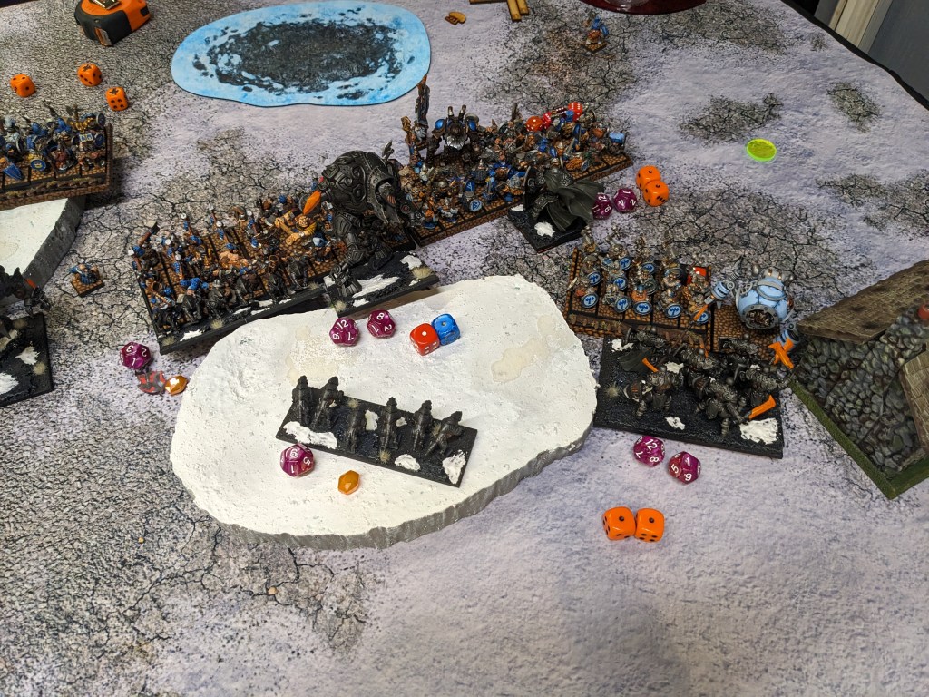 Some of the success on the right was due to going hard into Golloch and the Dwarf center in Turn 2. Not the wisest choice, but it bought me a lot of time and kept Golloch’s guns quiet until Craggoth eventually arrived to end his reign of terror. This after Craggoth had pressurized and pounded through the left flank, with two Earth hordes combining their power to crush the third Dwarf horde in one go. Faber was a major thorn in my side on that flank all game, but I did my best to ignore / mitigate his attentions, for a …