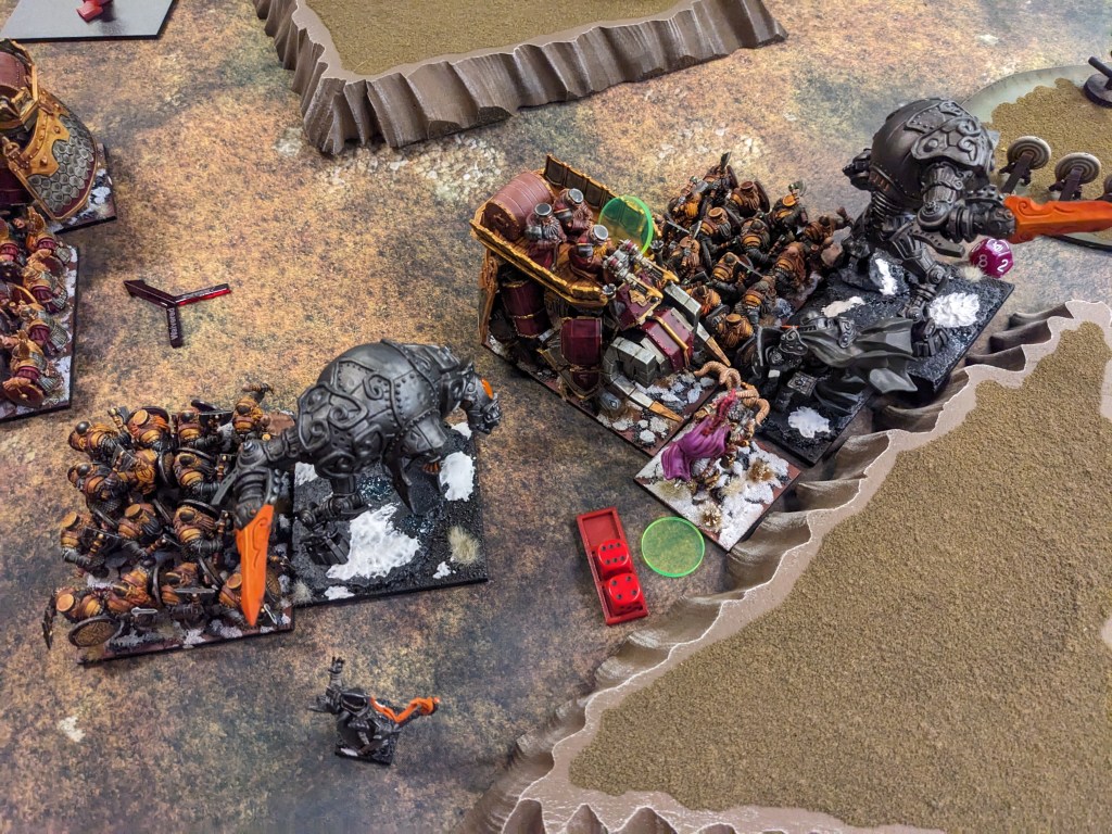 I opened the game up by starting to dig out tokens with my Mastiffs and aggressing some of Joe’s Sharpshooters on the left with Craggoth, and was rewarded with dead Mastiffs and a snake eyes for the Cragster’s efforts 😐 I lost an Earth horde to shooting early on as well, so that when our lines crashed and the grind began in earnest I was on the back foot. I think top billing goes to Joe’s central beast lord, who bounced back and forth, rear charging multiple Earth hordes to death. Despite the early snakes, Craggoth kept an entire flank occupied by itself, shrugging off Ironguard and laser focused on scooping up tokens. It didn’t kill much, but being a tough distraction let the Stoneclaws rear charge through a couple of Joe’s units before behind silenced.