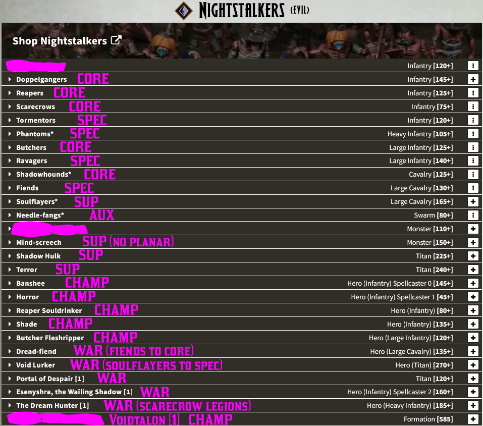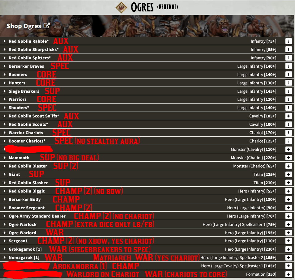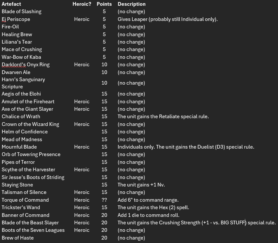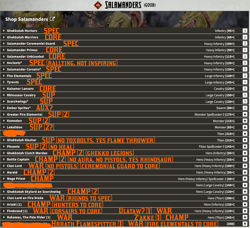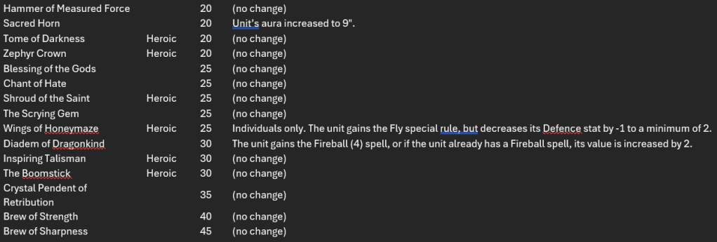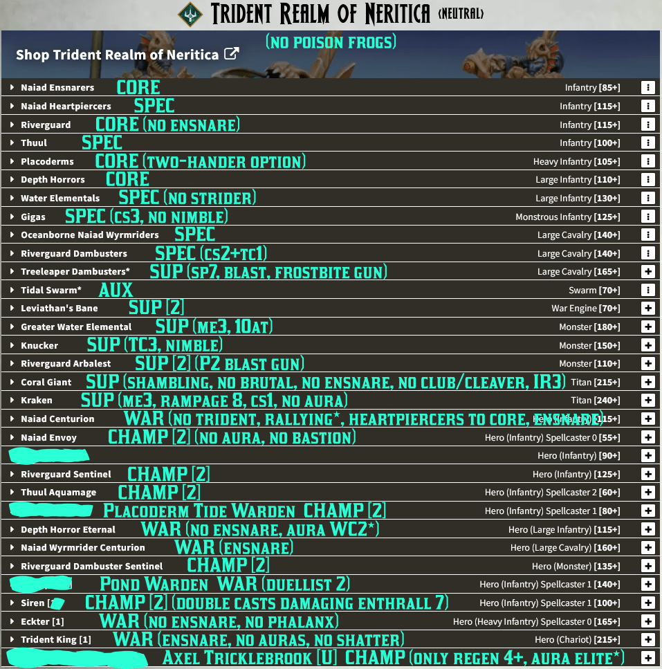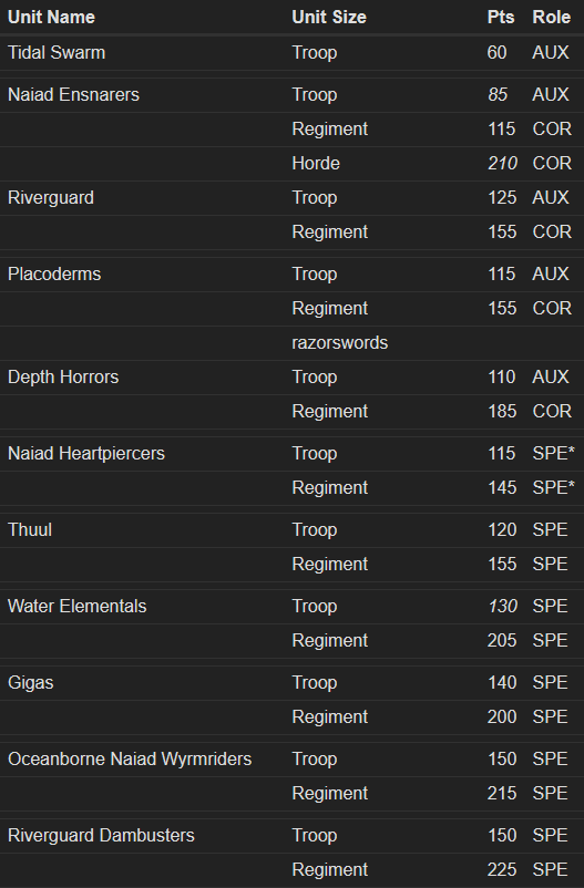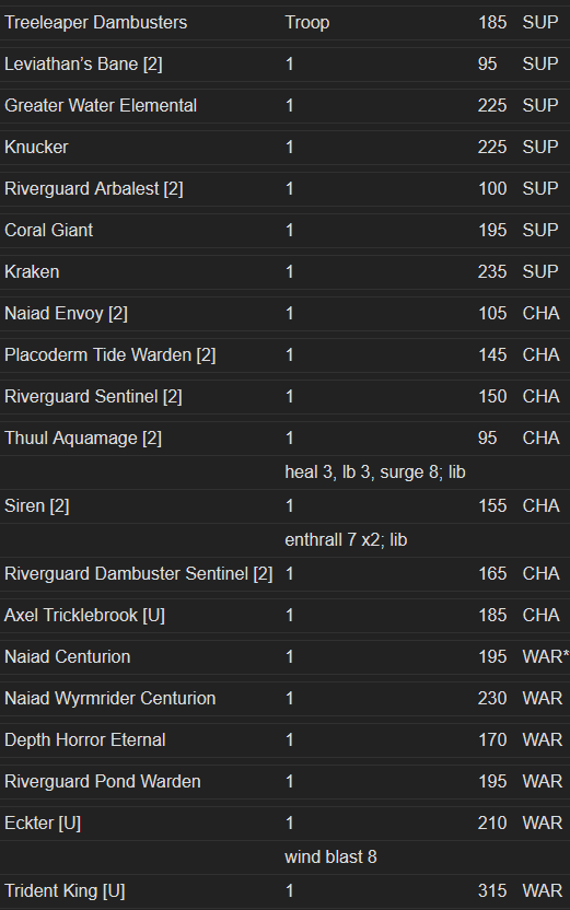 Points in italics I’m unsure of yet: Naiad Ensnarer troops (+5?) and hordes (-5?), Water Elemental troops (-5 or 10?), the Aquamages spells (20/20/30 if I had to guess), and whether or not the Me3+ CS1 De5+ upgrade on the Placoderms costs 5 points or is free. Sorry for the image, WordPress doesn’t allow pasting into a table, but here’s a spreadsheet version should you need it: