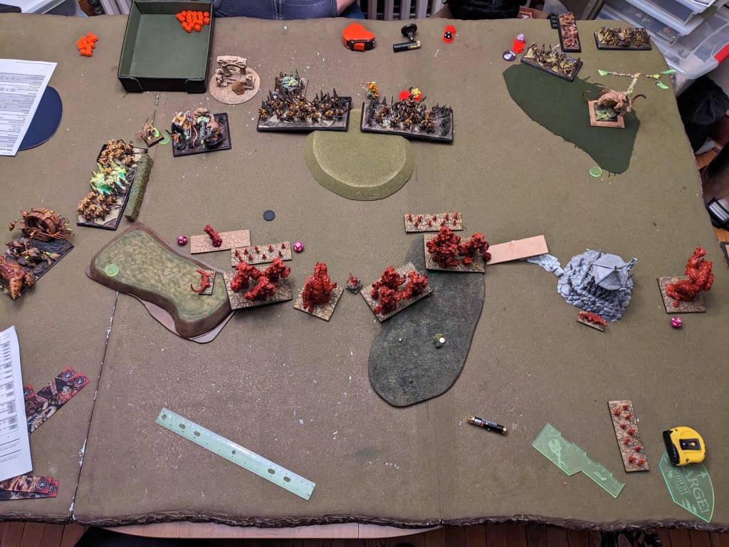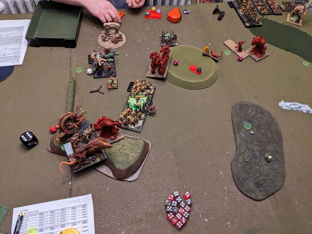 Salamanders 5: I am feeling decidedly light on the table 😬 On the right, a Slasher flanks the Mutant Rat-Fiend and tears it apart (the War Chief was just out for the reroll) with the help of the Fire reg. The surviving Raptor Lord takes precisely 2 bites out of the War Chief (even with host shadowbeast +4 O_O), before the Fire horde on the hill burns the Shock Troops down. They face the Nightmares, heavily damaged or no. I debate for a long time and end up bombing the other Slasher into the Tunnel Runners. He’s a big punchy boy and if he can hold, he can probably grind the chariots out and score that point. He lands 7 damage out of 10 attaks, which is a brilliant start.