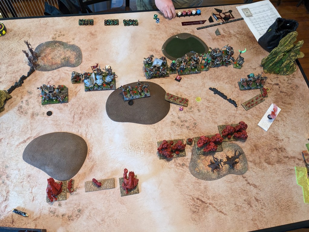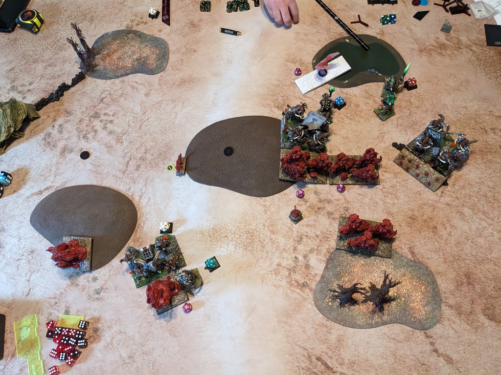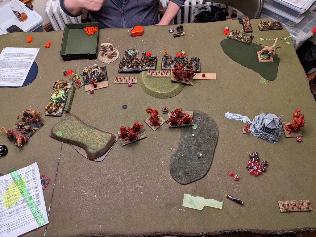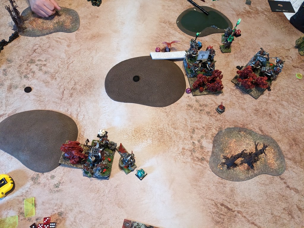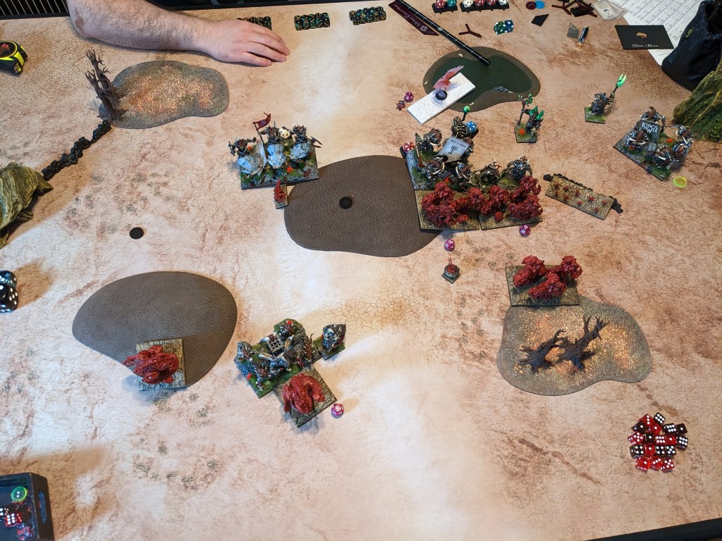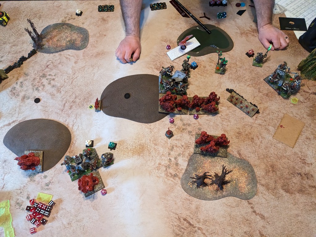 Turn 4: Ratty retaliation is swift and deadly. The Warrior horde (hindered) flanks the Raptor Lord, driving him off despite 6+ to hit (Brood Mom only helped so much), shortly before the Nightmares clubbed the Fire Elemental reg to goo. On the hill, the unengaged Shock Troops splattered some Ember Sprites with the War Chief’s help, and the right Shock Troops chunk 10 damage into the Fire horde thanks to bane chant from the Tangle. Finally, the Tunnel Runners toe onto the lower left hill, although I’m not certain their leader point was on or not? Also the Clawshots tag another 2 damage on the right Slasher (6 total).