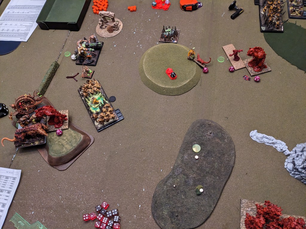 *This was a mistake that I realized after passing the turn. The left Slasher can currently see the Hunters’ flank if they engage the Fire reg, and potentially if they kill them as well … but what if it’s a combo-charge with the Bully right next to them? And what if they overrun?