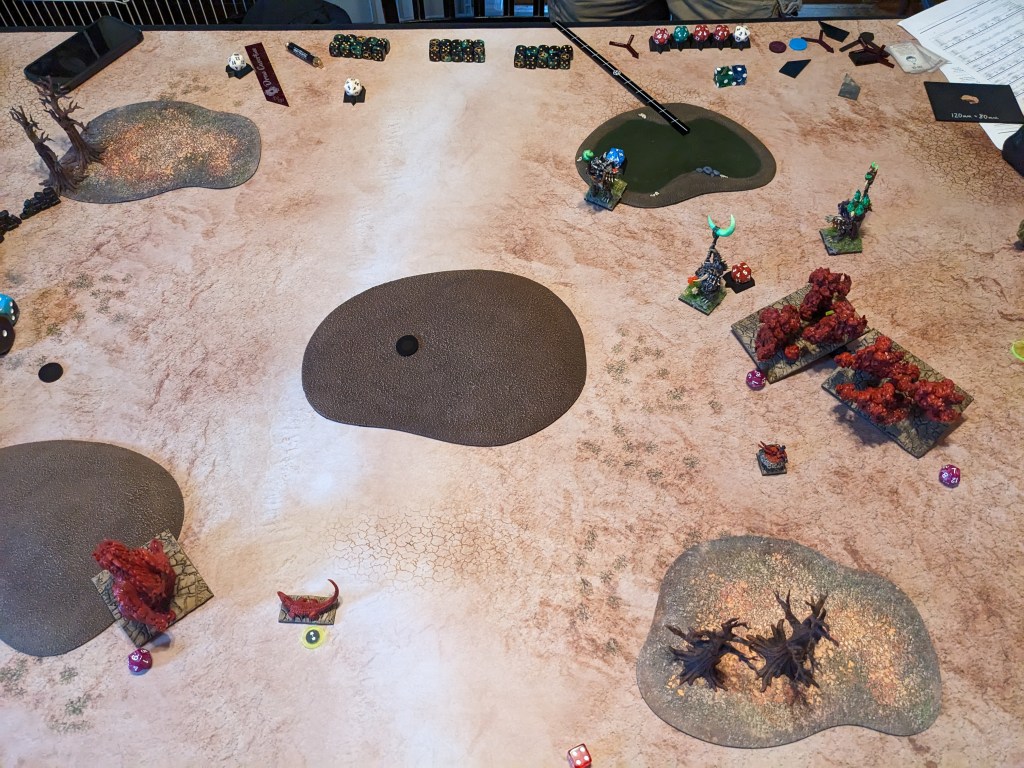 Bloodfire, smash! The mangled Fire horde finishes off the heavily damaged Shock Troop horde, turning to face the other Shock Troops as the Fire reg blocks the Mutant Rat-Fiend. Meanwhile a fresh Fire horde plows into those Shock Troops, punching them to 11 damage with the help of some friendly Ember Sprites and scoring a waver! Which won’t mean much because Tangle but still! The third Fire horde slams into the Nightmares but only manages a statistically expected 7 damage. Last but not least, the tox bolt party kicks up again as one Slasher tags 1 damage into the Tunnel Runners and the other blasts the second Clawshots troop off the table. Nice.